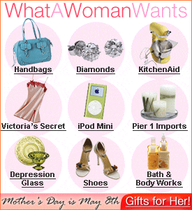 What A Woman WantsHandbagsDiamondsKitchenAidVictoria's SecretiPod MiniPier 1 ImportsDepression GlassShoesBath & Body WorksMother's Day is May 8thGifts for Her