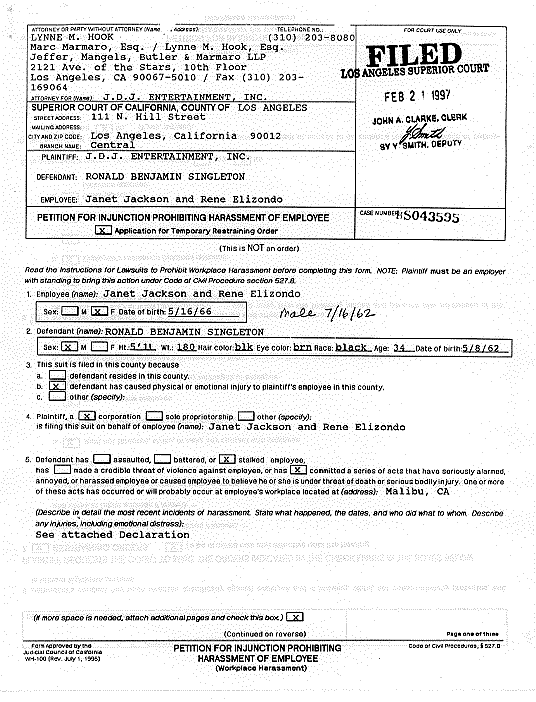 BACKSTAGE: Sneak a peek at Janet Jackson's concert rider MANIPULATED: Ex-hubby claimed Janet exploited him CLAIM: Janet ordered prescription drugs using ex-chef's name And you thought brother Michael was the only freak in singer Janet Jackson's life. A kook named Ronald Benjamin Singleton has shown up at the entertainer's Malibu home claiming to be Jackson's husband as well as the "King of Jerusalem." Jackson and her beau, Rene Elizondo, recently filed these court papers to secure a restraining order against the delusional Singleton, a 35-year-old Wisconsin native. (5 pages) | |||