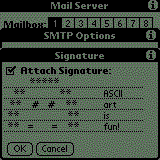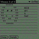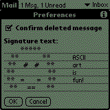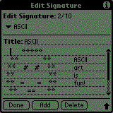 How do you include ASCII art on your Palm computer's mail signature? Here's how you can include ASCII art in your .sig, for people who use the built-in Mail program, MultiMail Pro 2, or HandMail.