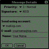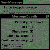 In HandMail, click the Details button when you create your message. Pull down the Signature list and select the signature you wish to use, then tap OK, as shown in Figure F.