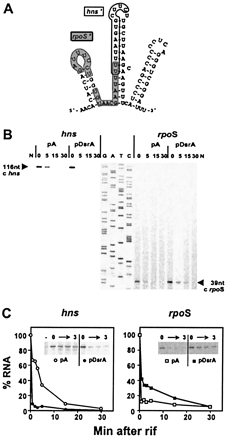 Previously, DsrA was shown to decrease the levels of H-NS protein, but not steady-state hns mRNA levels (4). Because H-NS represses its own transcription (6), a decrease in H-NS protein should lead to increased hns mRNA levels. How, then, does DsrA block synthesis of H-NS? Curiously, DsrA decreases the steady-state mRNA levels of a Dhns null mutant, in which autoregulation is abolished (4). Therefore, we hypothesized that DsrA exerts an effect on hns RNA turnover. To test the effects of DsrA on RNA turnover, the initiation of RNA synthesis was inhibited with rifamycin and RNA levels were assayed by primer extension analysis. When overproduced from a plasmid (pDsrA), DsrA substantially decreased hns mRNA stability relative to vector (pA) controls (Fig. 1 B Left). Quantitation of mRNA levels taken from 1 to 30 min after addition of rifamycin shows that hns mRNA levels dropped immediately after rifamycin addition, with a sharp decrease in mRNA half-life, from ~4 min to <0.5 min (Fig. 1 C Left), a greater than 8-fold difference.