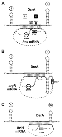 DsrA complementary to hns are depicted as boxed (region 2.1) and as white