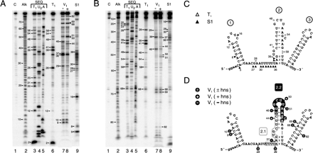 DsrA. (B) Footprinting of 3'-labeled DsrA. Lane numbers are given below, with