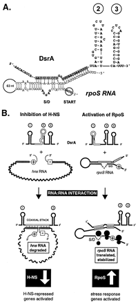 RNA plays a variety of regulatory roles in the cell, in addition to its central function in translation processes. These activities are collectively termed riboregulation (1). RNA-RNA interactions provide a basis for sequence-specific RNA regulation of other RNAs in both prokaryotes and eukaryotes (2, 3). DsrA, an 87-nt untranslated RNA in Escherichia coli, is one such regulatory RNA. DsrA contains regions of sequence complementarity to at least five different genes, hns, argR, ilvH, rpoS, and rbsD (4), and it has been demonstrated to regulate two of these genes, hns and rpoS, by RNA-RNA interactions (4, 5).