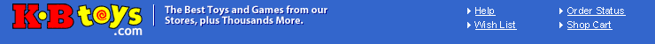 Shop Cart | Your Account | About Us | Shipping Information | Newsletter Career Opportunities | Site Map | Affiliate Program Privacy Policy (Updated May 1, 2005) Need answers? Visit our help section or review your order status online. ©2005 eToys Direct™, Inc. All rights reserved. "KBtoys.com" is a trademark of KB Holdings, LLC. Terms. |
