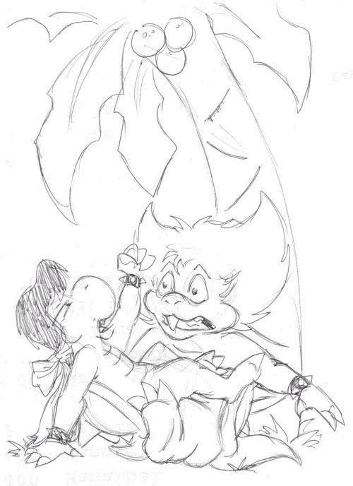 "JUMPER!!! GET DOWN HERE!!!" she bellowed into the tree, ignoring Ludwig once more. There was a pause before a rather timid-looking Buzzy Beetle scampered down the bark of the tree and stopped at its owner's feet, making apologetic cooing noises.