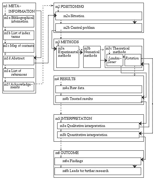 Our main division in modules is based on the characterisation of the information by its conceptual function. Our starting point is the prototypical section structure of scientific papers: Introduction, Methods, Results, Discussion and Conclusions. This sequence represents the normal flow of a scientific narrative, but the way it is used in practice presupposes that the article will, indeed, be read sequentially from the beginning to the end. One of the main arguments in favour of modularity is that knowledgeable readers hardly read articles sequentially but browse through them, looking for useful bits and pieces. In our approach, we take that behaviour as our starting point and define our modules as entities that can be read independently. Thus, every module represents only one well-defined aspect of the article. Of course, this independence does not mean that one module is in general sufficient to understand the whole work. Modularity enables the reader to zoom in immediately on those aspects he/she is interested in. If so desired, the whole work, i.e., all the related modules and if needed the necessary related information presented in meso- and macroscopic modules, can be retrieved and read as if it were a traditional article.