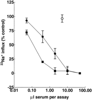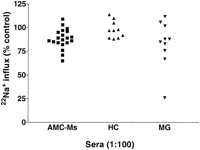 investigated their effect (1:100 dilution) on agonist-induced 22Na+ flux. In each case, AMC-M sera inhibited the 22Na+ flux