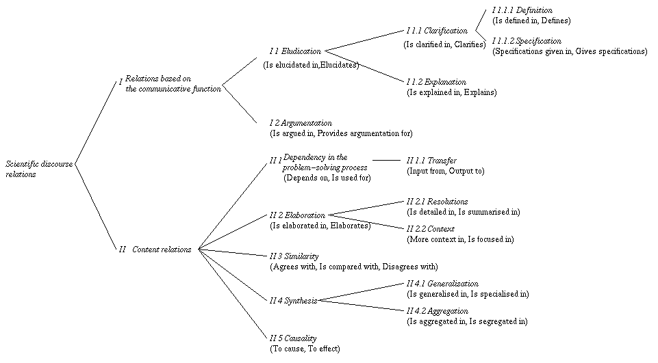 The second main class of relations: scientific discourse relations, allows authors to indicate why they refer to another module or another part of the same module. Following speech communication research, we arrive at two subclasses of scientific discourse relations. One class is based on the communicative function; the other type consists of Content relations between two relata.